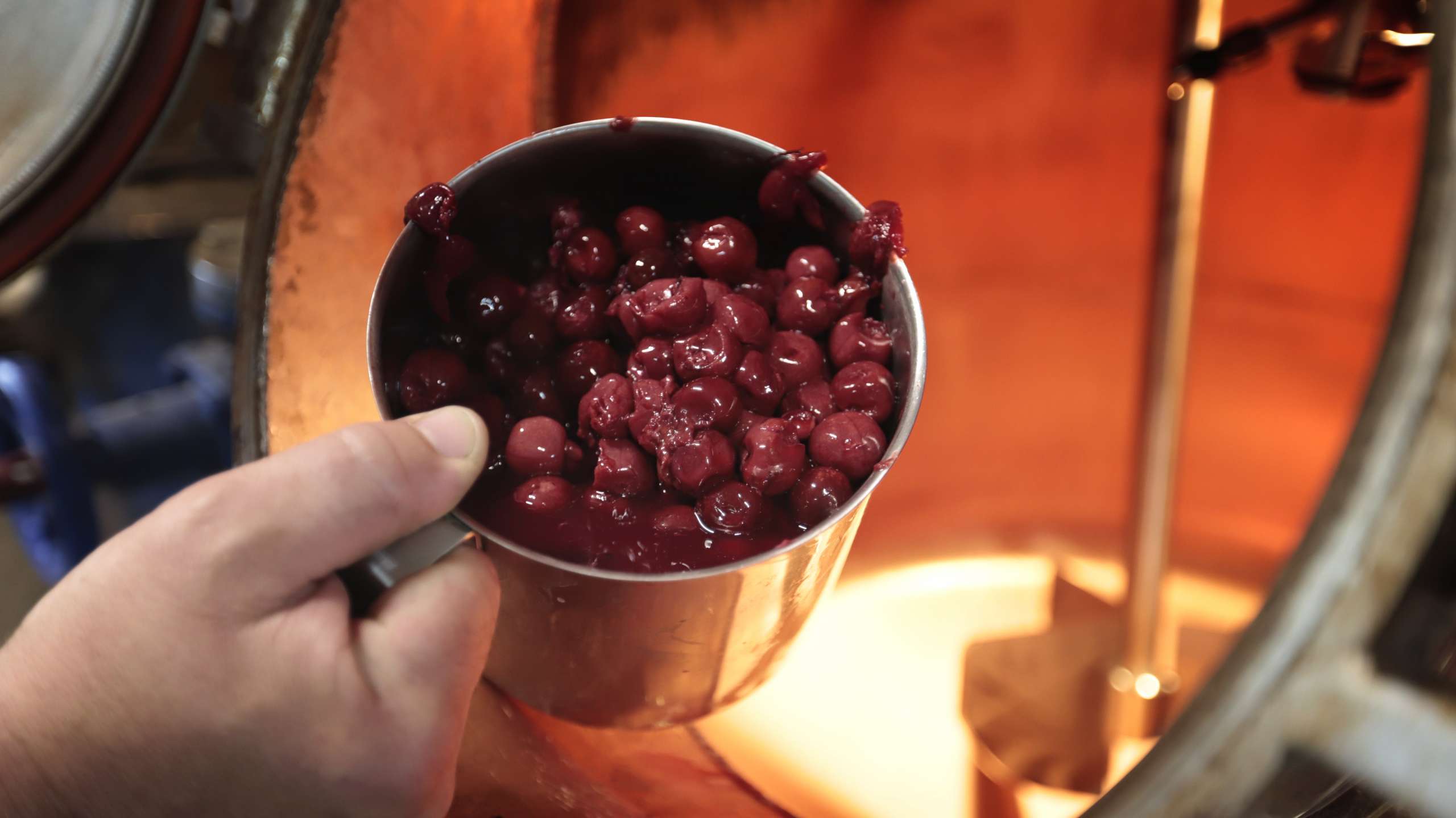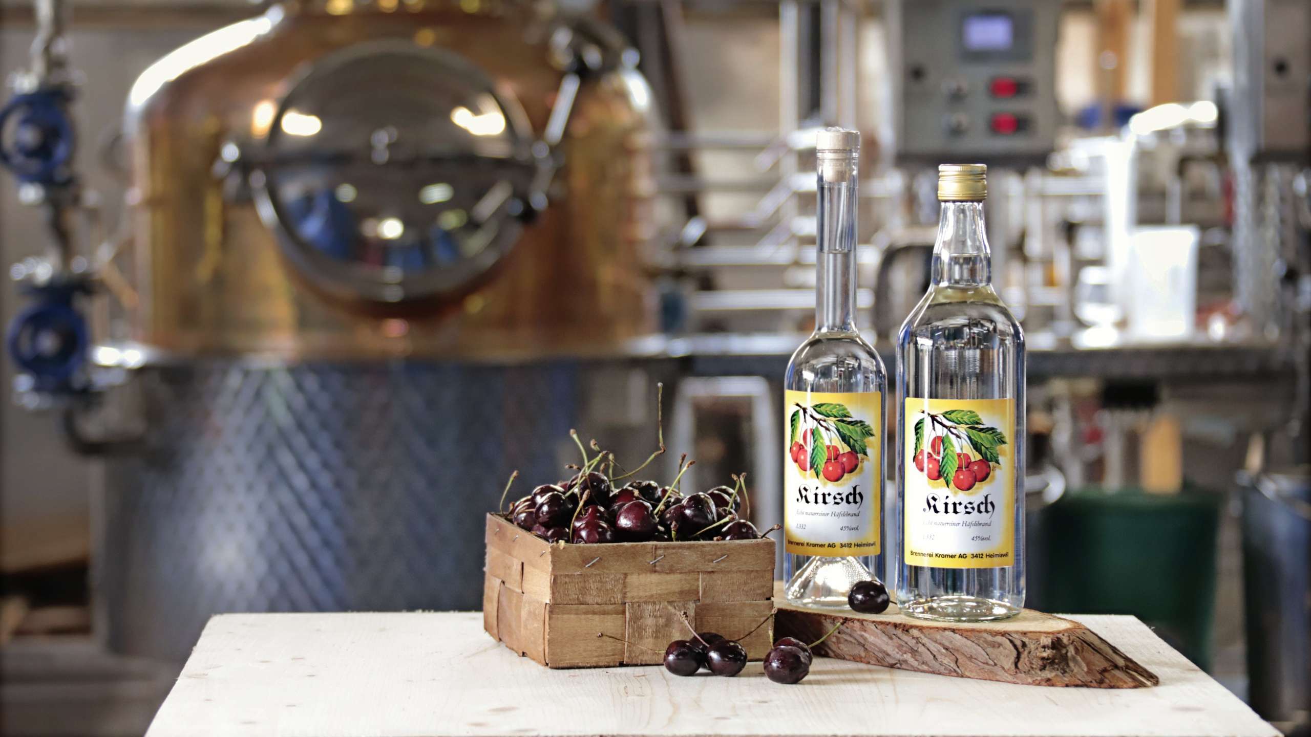 Das Wichtigste und absolut Entscheidende ist die Qualität des Grundstoffes, den man brennen will. «Wir brennen einen feinen Kirsch, und so verwenden wir feinste Kirschen, die im richtigen Moment geerntet worden sind.» Sobald die Kirschen reif genug sind, also so, dass man sie auch pflücken und essen würde, kommen sie gereinigt und ohne Laub oder Stiele in ein Fass. In den nächsten Wochen ist es wichtig, die eingelegten Früchte regelmässig zu «schtünggele», heisst sanft zu zerdrücken und umzurühren. Durch die Verletzung der Kirschen wird der Gärprozess beschleunigt und der entstandene Saft auf der Oberfläche garantiert zudem, dass keine Luft-einlagerungen im Fass sind. Bei diesem Vorgang ist es wichtig, den Stein der Kirsche nicht zu verletzen. Denn dieser beinhaltet Bitterstoffe, welche den Geschmack beeinträchtigen würden. Beim Gären wandeln Bakterien den Fruchtzucker zu Alkohol um. Früchte sind von Natur aus mit Mikroorganismen wie Hefen und Bakterien belegt. Wird die Frucht verletzt, finden diese gutes Futter und vermehren sich schnell. Hefen vergären Zucker zu Alkohol. Der Deckel auf dem Fass wird mit einem Gewicht beschwert, damit es zwar verschlossen ist, die durch den Gärprozess entstehenden Gase aber entweichen können. Dieser Vergärungsprozess ist nach ca. drei bis vier Wochen abgeschlossen und die Kirschen sind bereit für den Brennvorgang.