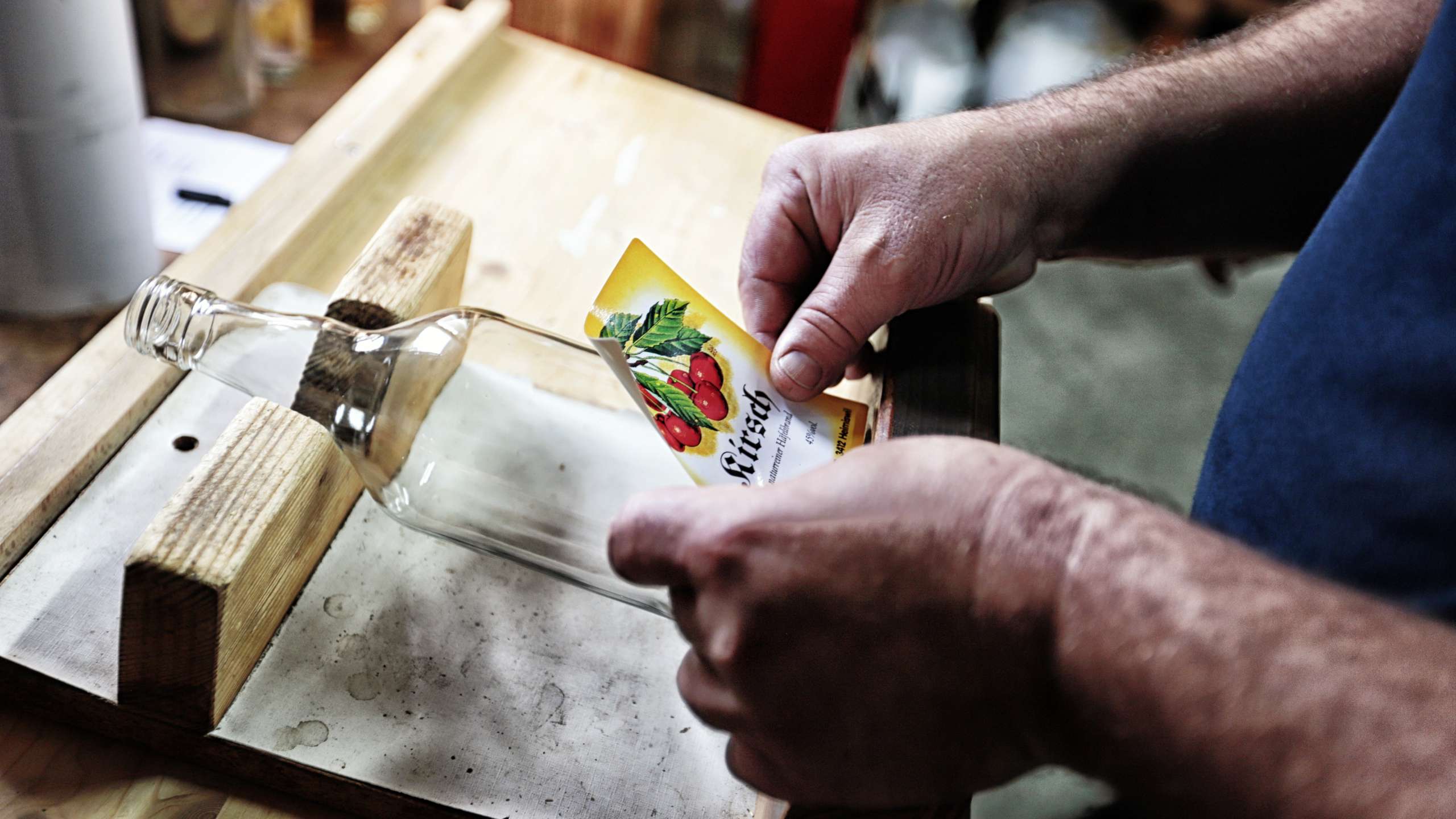 Da die meisten Kunden ihre Schnäpse mit vierzig und fünfzig Volumenprozenten wünschen, muss der Alkoholgehalt des fertigen Destillates von den ursprünglichen rund achtzig Prozent auf diese gewünschte Stärke heruntergesetzt werden. Dazu verwendet Simon enthärtetes und demineralisiertes Wasser. Sobald der Wasseranteil jedoch die Hälfte übersteigt, wird der Schnaps trübe und muss gefiltert werden. Dazu wird das flüssige Hochprozentige heruntergekühlt und durch einen Filter aus gepresster Zellulose geleitet. So erhält er seine Klarheit zurück. Jetzt wird der wieder klare Brand in die Flasche gefüllt, und fertig ist die beliebte Emmentaler Spezialität.
