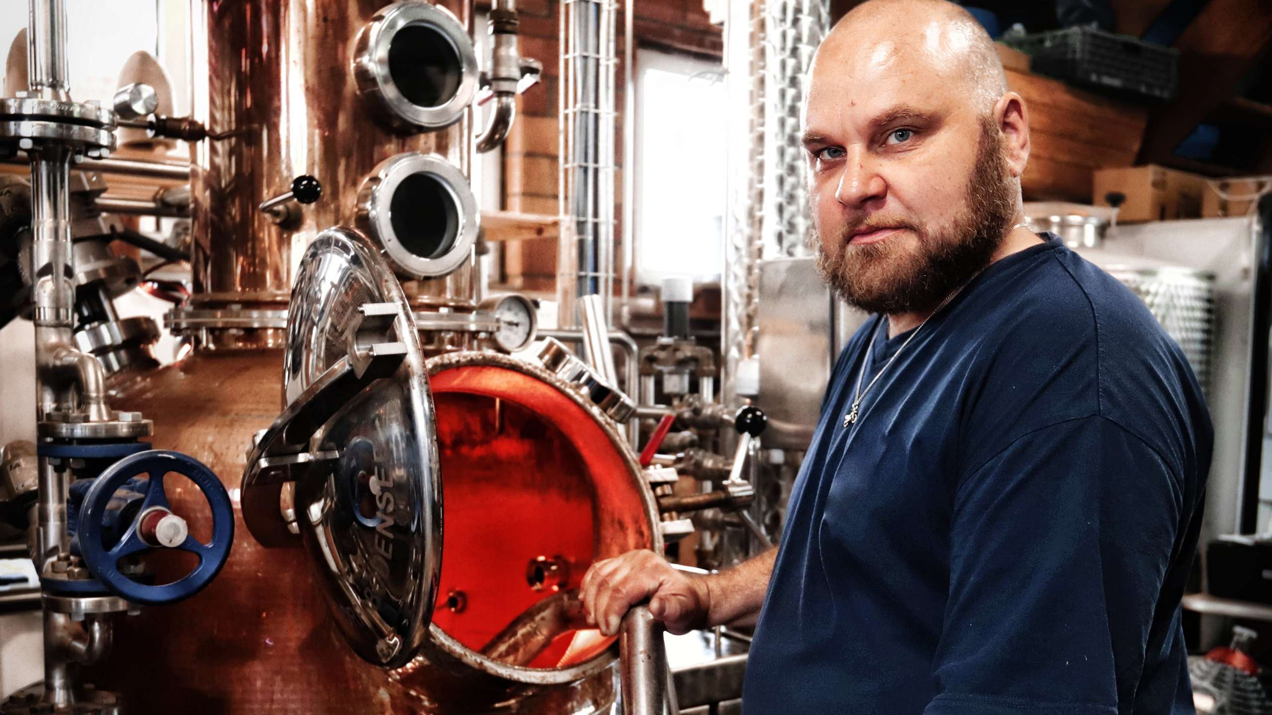 Die Früchte werden in die Brennblase geschüttet, der Deckel wird geschlossen. «Wir feuern ein und erzeugen im Dampfkessel den Dampf, mit welchem die Maische, also die vergorenen Früchte, auf 85 Grad Celsius erhitzt wird.» Da Alkohol einen anderen Siedepunkt als Wasser hat, verflüchtigt sich dieser bereits bei 78 Grad Celsius aus den Früchten und steigt durch die Brennblase empor. Nur aufgrund dieser physikalischen Tatsache ist es überhaupt möglich, den Alkohol auf diese Art und Weise vom restlichen Material zu trennen. Im obersten Teil der Brennblase wird der Dampf in ein Chromstahlrohr, auch genannt Geistrohr, gelenkt und gelangt von dort in den spiralförmigen Kühler, wo er sich abkühlt, kondensiert und in flüssiger Form durch die Vorlage in den Chromstahlkessel fliesst.