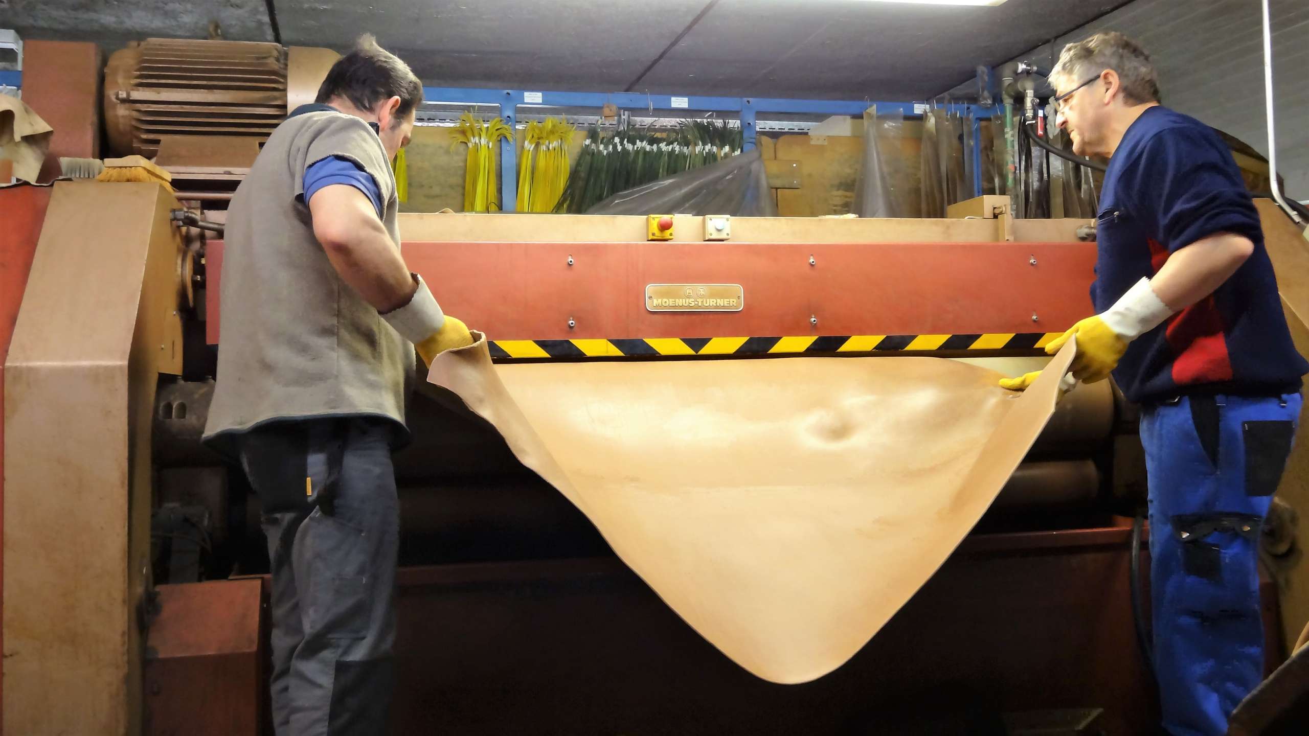 In einem anderen Teil der Anlage werden Lederstücke gefettet, gefalzt oder nachgegerbt. Gefalzt bedeutet, dass das Leder mithilfe einer Maschine auf der Fleischseite beziehungsweise Innenseite mit Spiralmessern abgeschabt und auf die gewünschte Dicke gebracht wird. Gefettet wird Leder, wenn es sehr weich sein muss. Dazu wird das Leder in meterhohe Trommeln gesteckt und heisses Fett zugegeben. Auch Leder mit starken Kratzern kann wieder verschönert werden. Dies geschieht in der Schleif-Strasse. «Auf dieser Anlage produzieren wir auch Nubuk-Leder (Rauleder)», erklärt Markus Meyer. Wir gehen weiter und beobachten zwei Arbeiter beim «Ausrecken»: Die noch feuchten Rohhäute werden dazu in eine Maschine gelegt, wo ein rotierender Zylinder mit stumpfen Spiralmessern die Falten ausreckt. Danach werden die Häute zum Trocknen aufgehängt. Anschliessend wird das Leder noch maschinell gestollt, also geklopft, damit es weicher wird und besser weiterverarbeitet werden kann. Trotz Maschineneinsatz kann die Gerberei auf kräftige Hände sowie viel Geduld und Erfahrung nicht verzichten, damit aus den Rohhäuten hochwertige Lederwaren entstehen können.