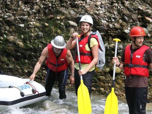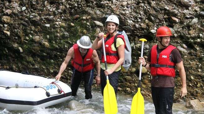 - Velo-Helm oder Kletterhelm, Badekleider, darüber eine Regenhose als Beinschutz, T-Shirt, evtl. leichte Regenjacke, Wasserschuhe zum binden (oder alte Turnschuhe), trockene Kleidung.