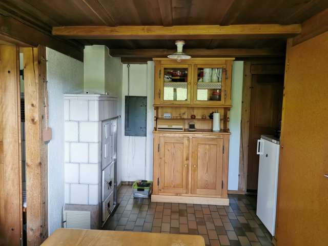 Wie eine Katze schmiegt sich das Althüsli in die idyllische Hügellandschaft. Vor dem Haus hat es einen grossen Gartensitzplatz, hinter dem Haus drei bis vier Parkplätze. Durch den grossen Vorraum mit Brunnen und Holzvorrat wird die Wohnung oder der Gruppenraum betreten.
