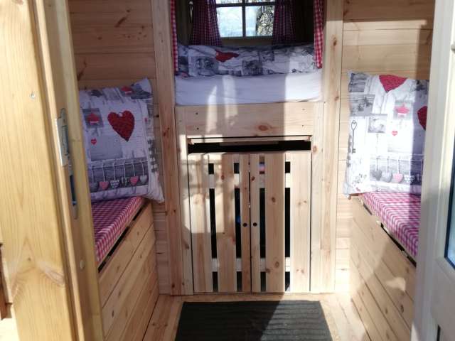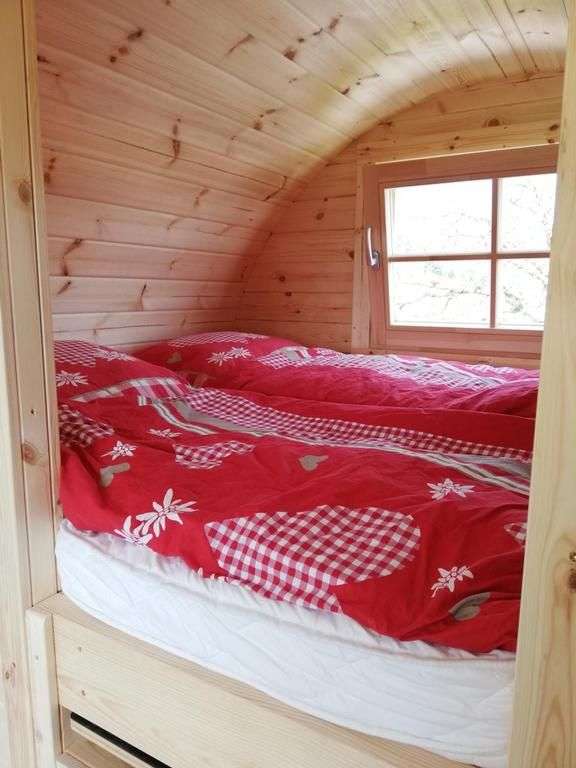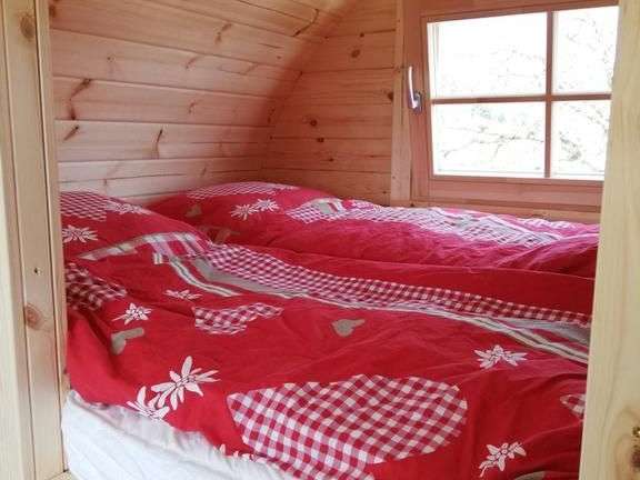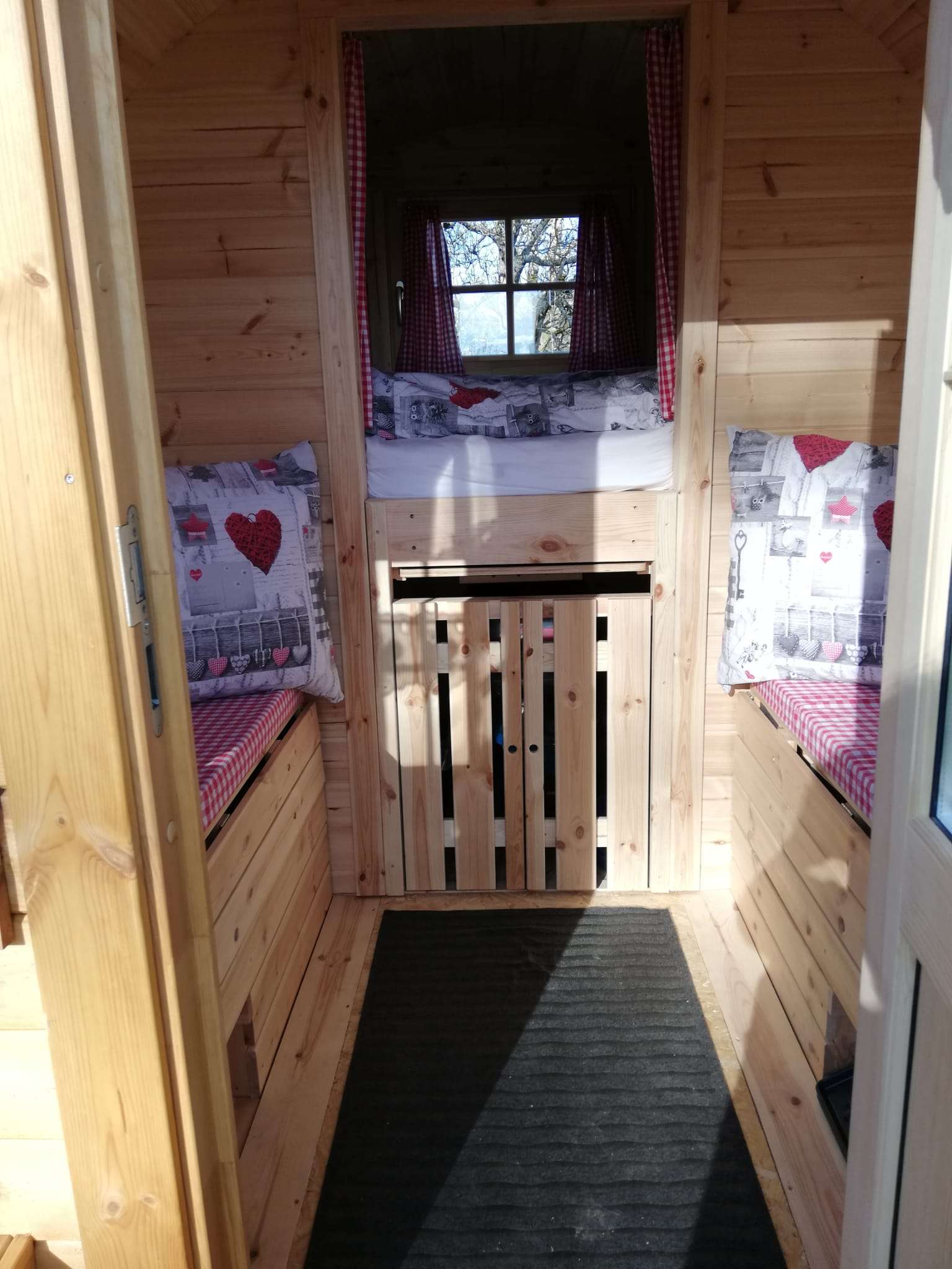 Sie schlafen in einem französischen Bett (2 Erwachsene), Kinder können auf den Schlafplätzen auf den Sitzbänken schlafen (nur 130cm lang!). Bett- und Frotteewäsche sind vorhanden, für Kinder müssen Schlafsäcke mitgenommen werden. Das gemütliche Wohnfass bietet eine ausziehbare Tischplatte mit zwei Sitzbänken an der Wand, Stauraum unter dem Bett und den Sitzbänken, Strom (1 Lampe, 1 Steckdose, 1 kleiner Elektro-Ofen zum Heizen falls es kalt wird), Campingausrüstung (ein Campingkocher mit 2 Platten, Campinggeschirr, kleiner Kugel-Grill sowie 2 Tische und Stühle) ein WC mit Lavabo, sowie eine einfache Dusche mit separatem Eingang auf Bauernhof, ein Kühlschrank mit Gefrierfach und ein gemütlicher Sitzplatz mit Cheminée mit Holz zum Grillieren.