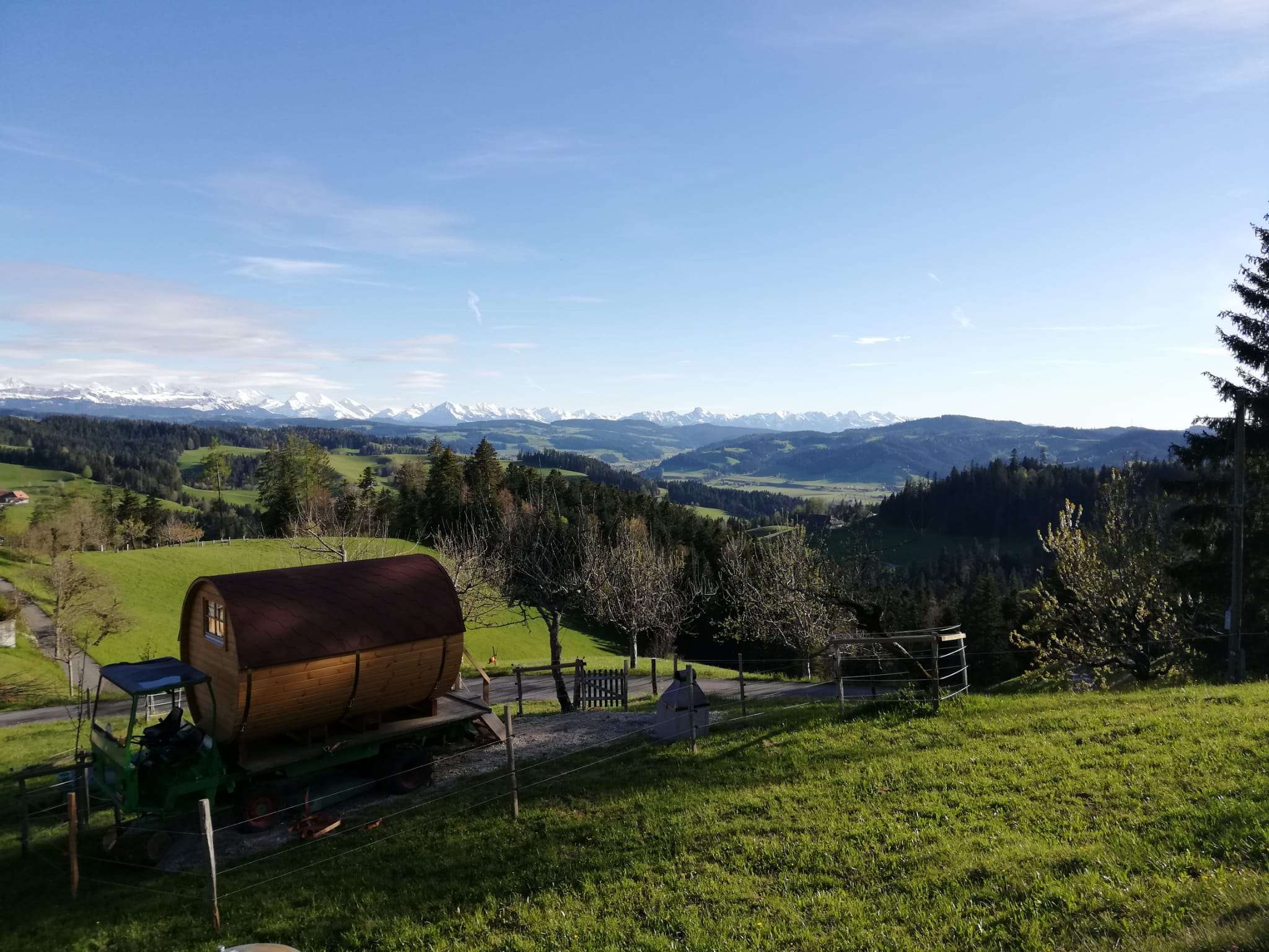 Romantische Idylle in den Emmentaler "Höger". Geniessen Sie eine Auszeit alleine oder zu zweit im Wohnfass. Am Morgen erwartet Sie ein reichhaltiger regionaler Frühstückskorb. Die Ober Mörisegg ist der ideale Ausgangsort für Wanderungen oder Velotouren im hügligen Emmental.