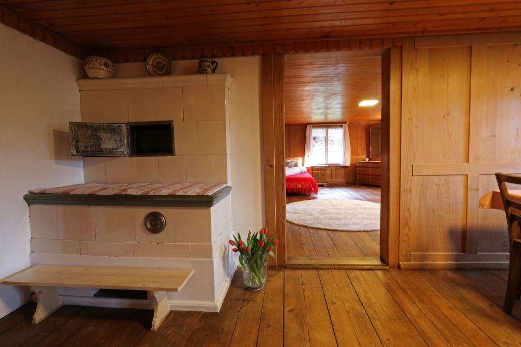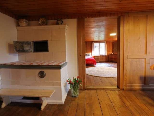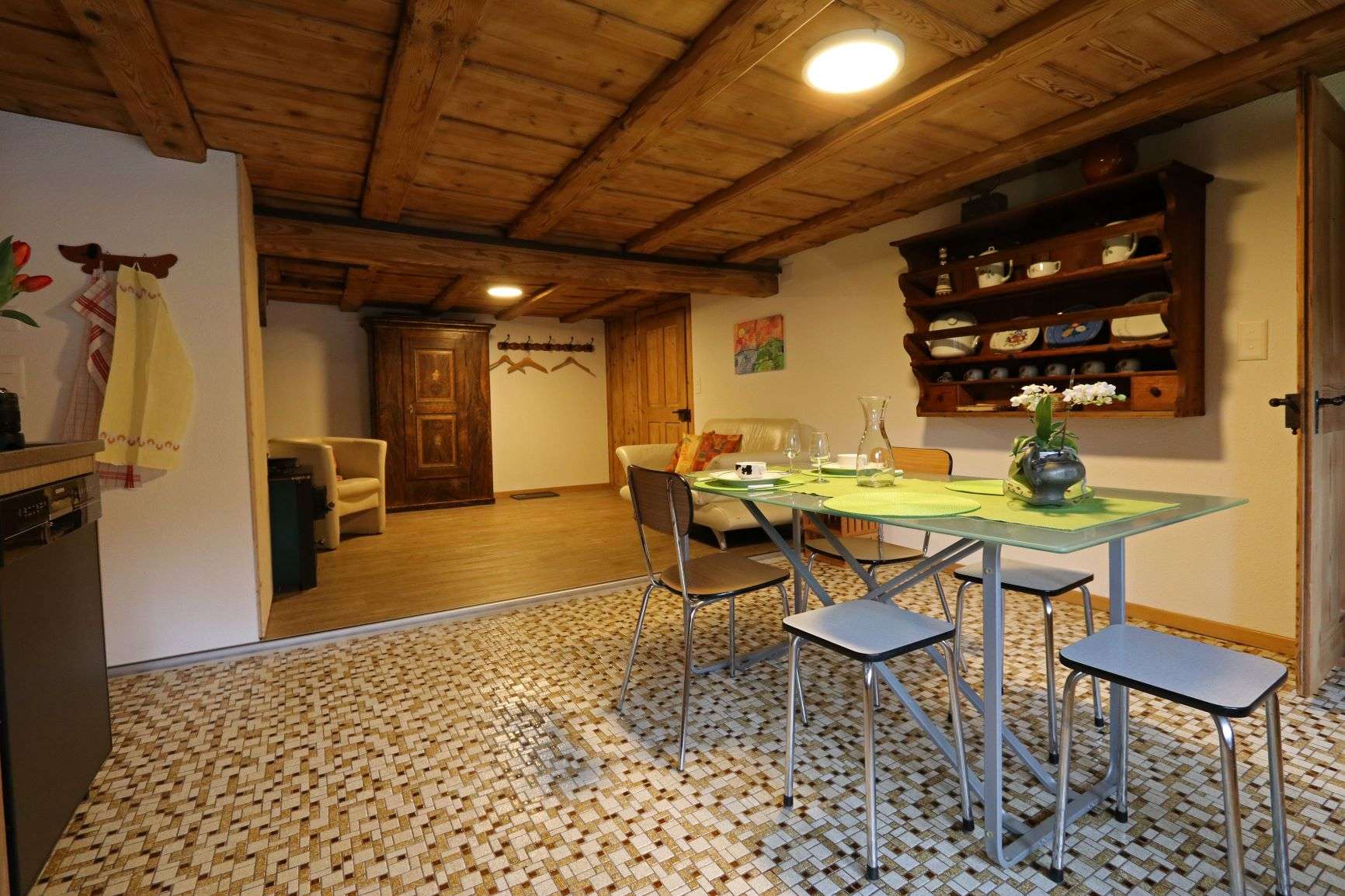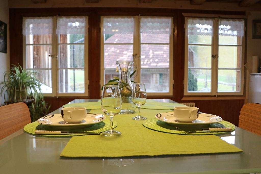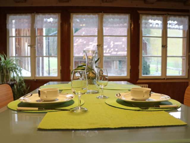 Mit viel Elan, Freude und Schweiss wurde im Bauernhaus (erbaut ca. 1850) die grosszügige Wohnung im 1. Stock sanft renoviert. Die Wohnung könnte sicherlich viele Geschichten von längst vergangenen Zeiten erzählen. Bei der Sanierung wurde vieles im Original belassen, wie z.B. in den beiden Schlafzimmern die sogenannten «Riemenböden». Prisca und Alfred Liechti, mit Tochter Katja sind die Betriebsleiter des Bauernhofs. Im Stall leben aktuell 18 Kühe (die Namen zählen wir hier nicht alle auf), Kälber (je nach Saison mehr oder weniger, aber alle mit Namen) und im Hühnerhof wohnen noch die Helga's (braune Hühner) und Hanni's (weisse Hühner) mit Manfred, dem Hahn. Die Mäusejagd-Experten sind die 2 Kater «Schörschu» und «Flöckli». Gerne begleitet die Familie Liechti Sie bei einer Stallvisite und wenn Sie gerne einmal tatkräftig mithelfen möchten, z.B. beim Kälbertränken, sind Sie herzlich dazu eingeladen. Wenn Sie mögen, können Sie die Milch direkt auf dem Hof beziehen und den frischen Sonntagszopf für ihr Frühstück bestellen.