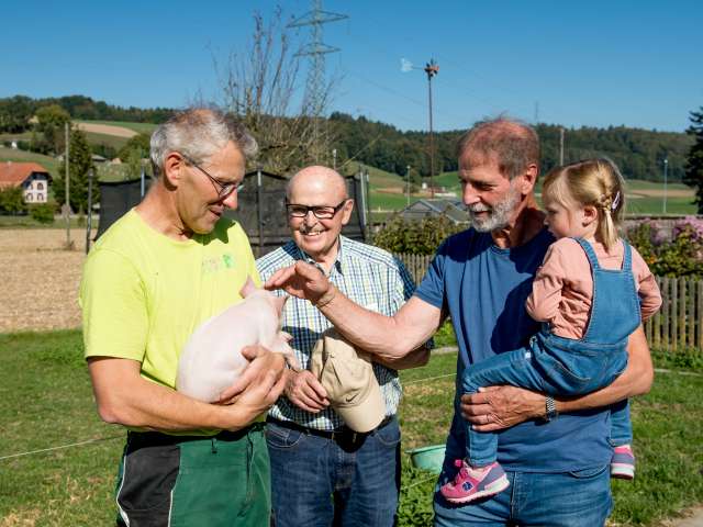 Kaffee, Tee, Süssmost, hausgemachtes Brot oder Zopf im Freien (unter Dach) und mit Trockenwurst und/oder Speckzüpfe sowie mit Infos über den Landwirtschaftsbetrieb und Garten.