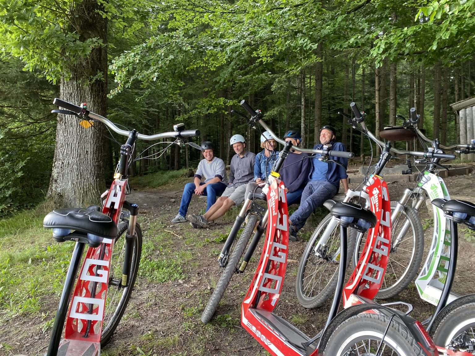 Für Ihre Entdeckungstour durchs Emmental stehen bis zu 20 E-Scooter bereit. Die «Hugo Bikes» sind eine Mischung aus Elektrofahrrad und Trottinett. Es reicht, am Startschlüssel zu drehen, und schon geht der Spass los. Das Elektrotrotti beschleunigt auch bergauf recht flott, und das grosse Vorderrad bietet eine Laufruhe, die sich gerade bei nassen Strassen als vorteilhaft erweist.