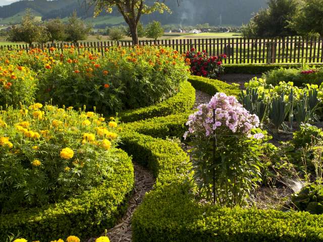 Besonders reizvoll an Emmentaler Bauerngärten ist die Verbindung von Nützlichem und Schönem. Die sorgfältig geschnittenen Buchsbaumeinfassungen lassen diese Gärten zu jeder Saison ordentlich und schön aussehen. Die symmetrischen Wege sind praktisch und wenn im Sommer Blumen sowie Gemüse überborden, sorgen sie immer noch für Struktur und für ein Gefühl von Ordnung. Die Wege werden stets sauber eingefasst und oft mit Rindenmulch belegt.