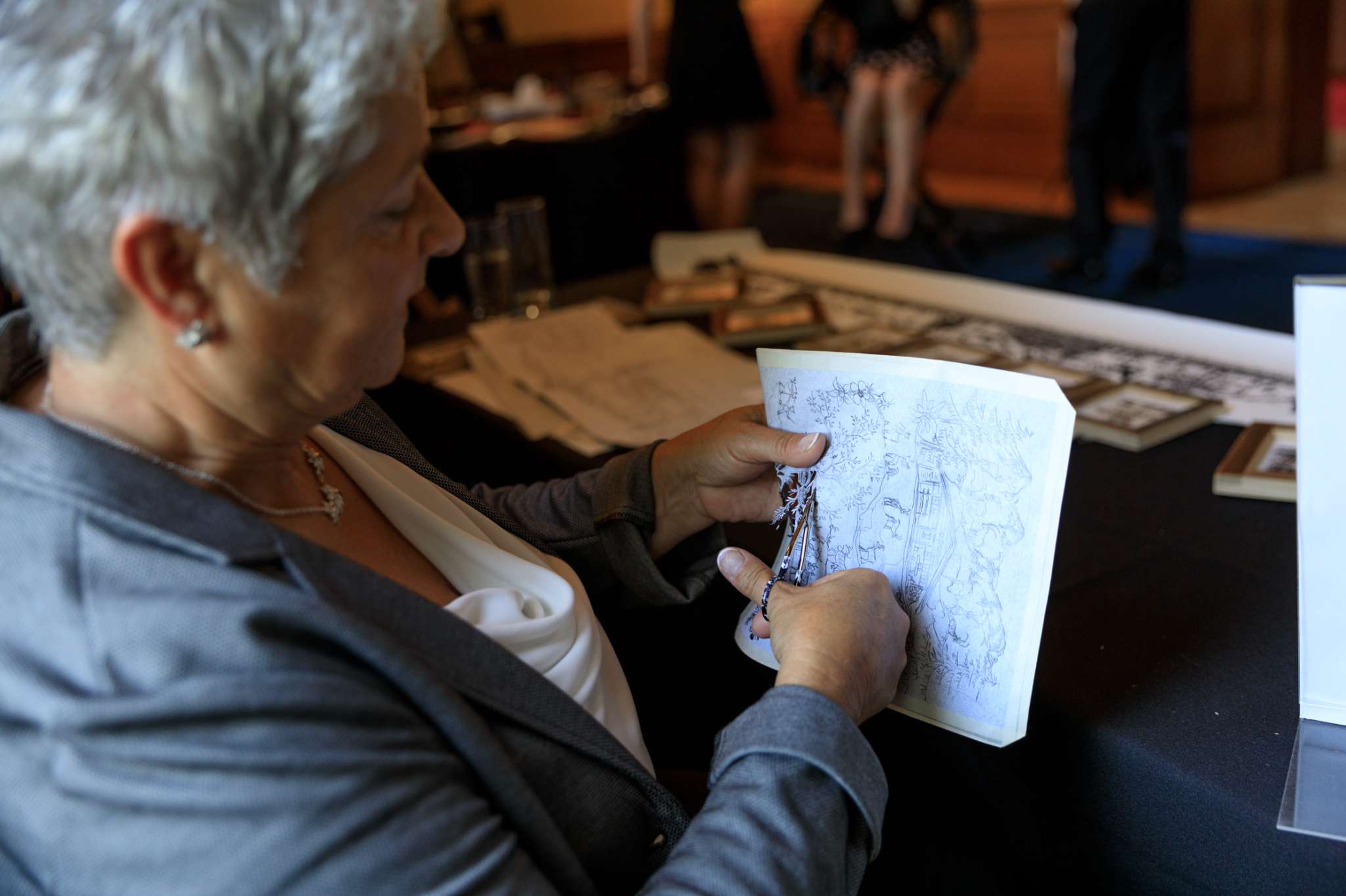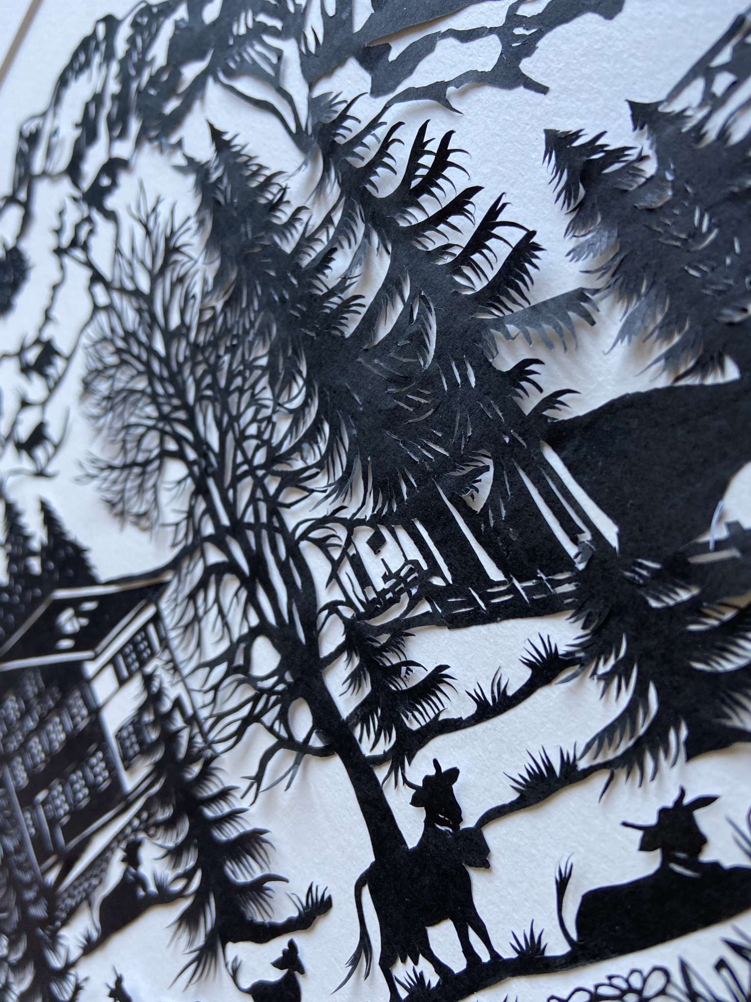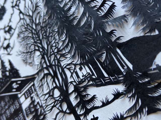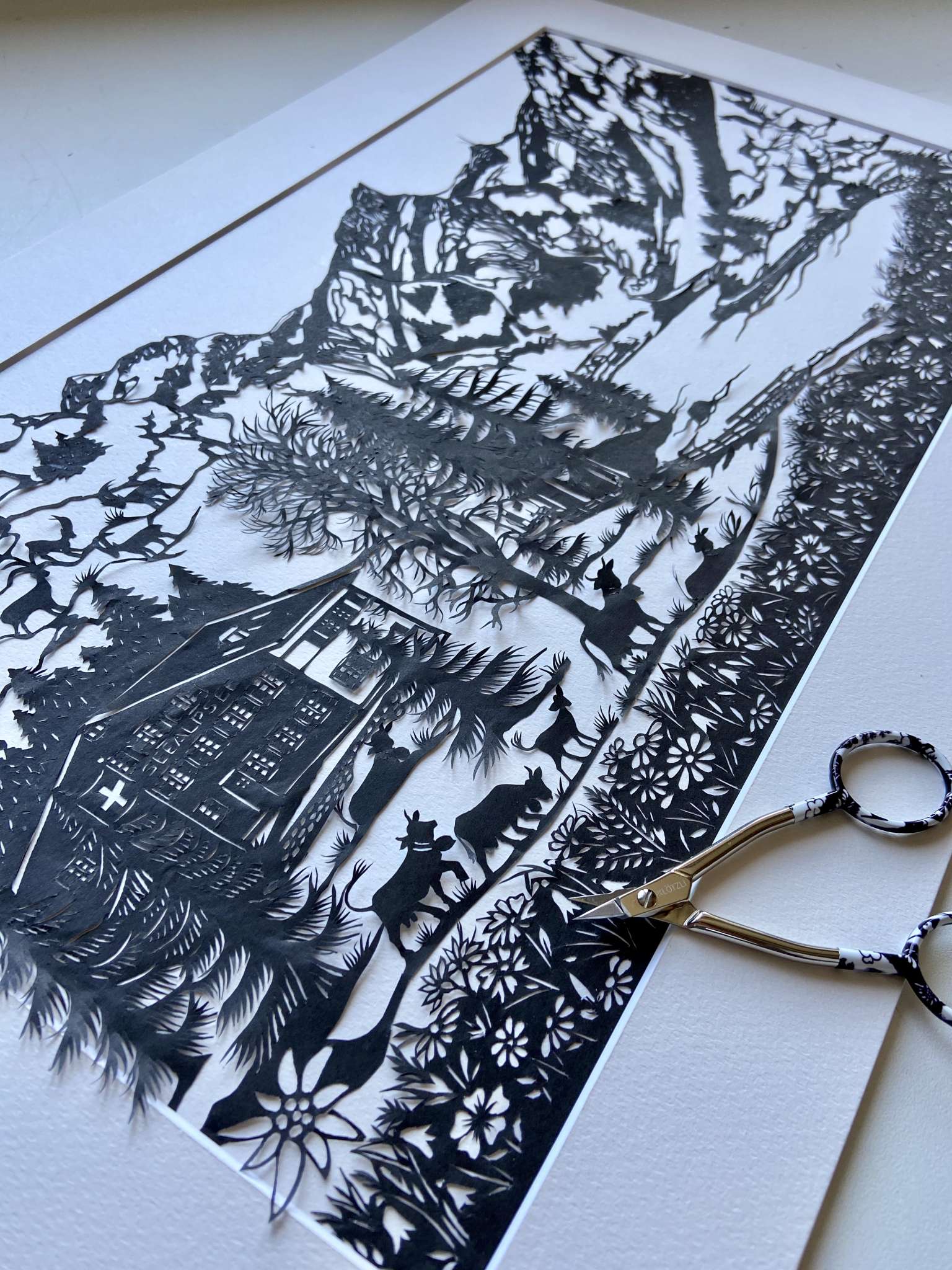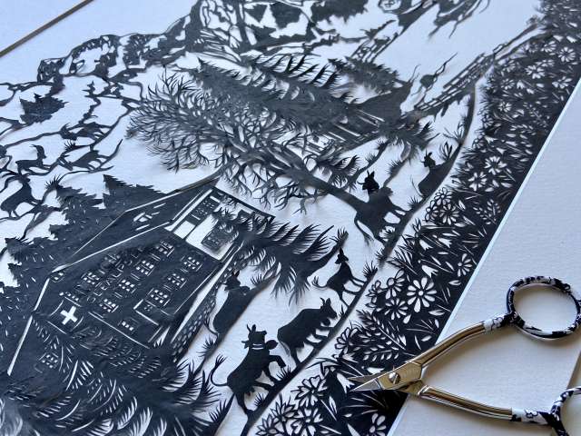 In tage- oder häufig wochenlanger Handarbeit zeichnet Esther Gerber traditionellen Bilder und schneidet diese von Hand einzeln aus. Das Ergebnis sind einzigartige Kunstwerke, die in Feinheit und Präzision kaum zu übertreffen sind.