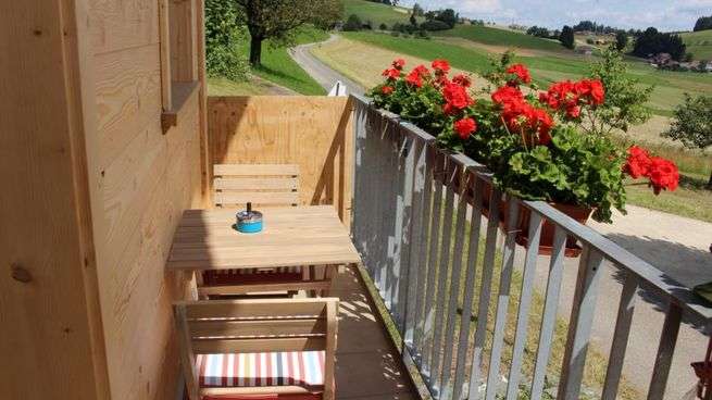 Heimeliges, neu gebautes Ferienhäuschen im hügeligen Emmental mit Blick auf die Alpen.