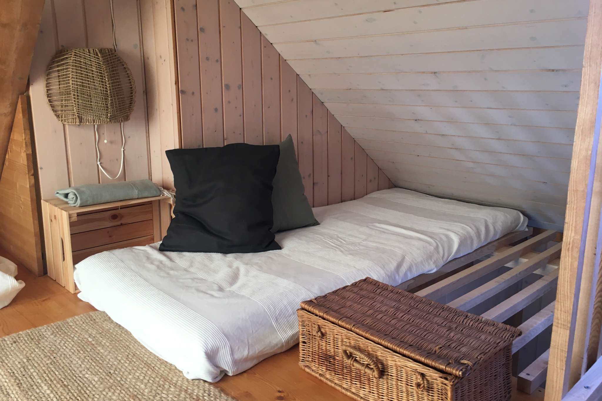 Entdecken Sie die beiden originellen Zimmer. Sie verbinden traditionelle, einfache Bauweise mit modernen Elementen und eignen sich für zwei bis vier (max. sechs) Personen. Die Zimmer weisen den Standard einer Jugendherberge auf. Sie verfügen über eine Teeküche und sind über eine steile Innentreppe mit der Nasszelle verbunden. Dusche und WC erreicht man bequem auch über eine gedeckte Aussentreppe.
