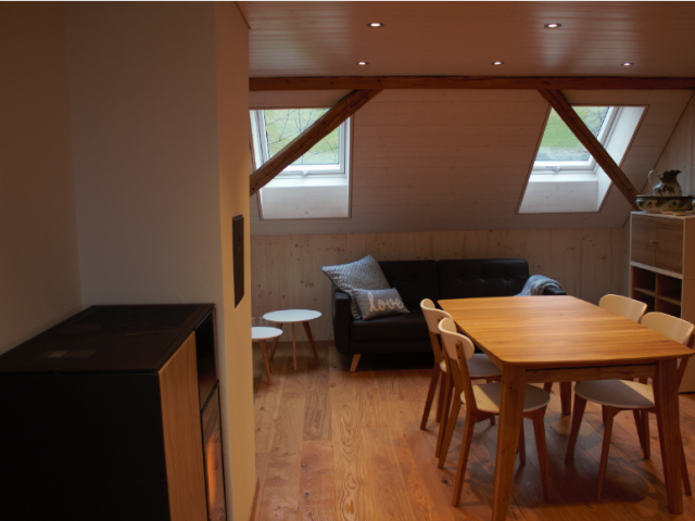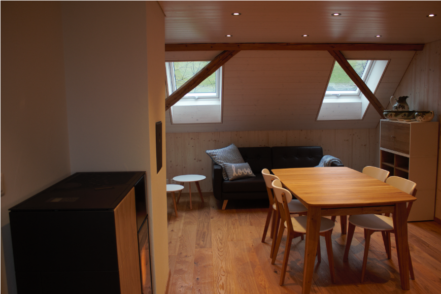 - Stube mit automatischem Pelletofen, ausziehbarem Tisch, Sofa, Dusche, WC, Lavabo