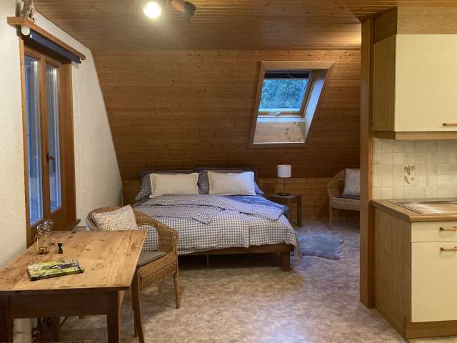 Die kleine, urchig-gemütliche Studiowohnung im 2. OG eignet sich bestens für kurze oder längere Aufenthalte. Sie bietet Platz für 2 – 3 Personen und ist Ausgangspunkt für viele schöne Wanderungen und Radtouren. Haustiere sind herzlich willkommen. Die Ferienwohnung bietet einen Park-, sowie einen Gartensitzplatz.