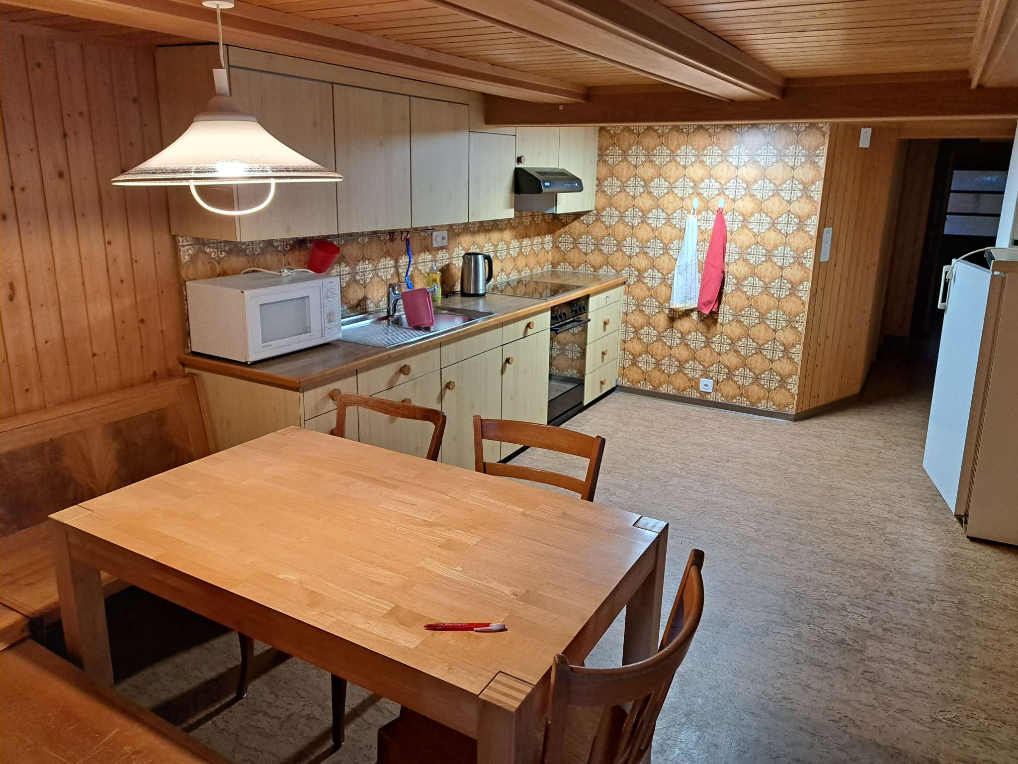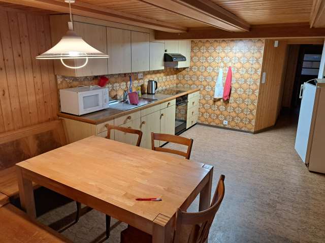 Die Wohnung hat eine heimelige Küche mit Eckbank und Esstisch für 6 Personen. Sie ist ausgestattet mit Mikrowelle, Fondue-Rechaud, Racletteofen, Gewürzen, Küchentücher, Nespressomaschine usw. In der gemütlichen Stube steht ein Bettsofa und ein Tisch mit Stühlen. Es gibt ein Schlafzimmer mit Doppelbett, mit Platz für ein Kinderreisebettli (auf Anfrage) und zwei Zimmer mit je einem Bett. Die Wohnung verfügt über ein Badezimmer mit Dusche und eigener Waschmaschine und ist mit Kissen, Wolldecken, Frottierwäsche, Spielen und Schreibsachen ausgestattet.