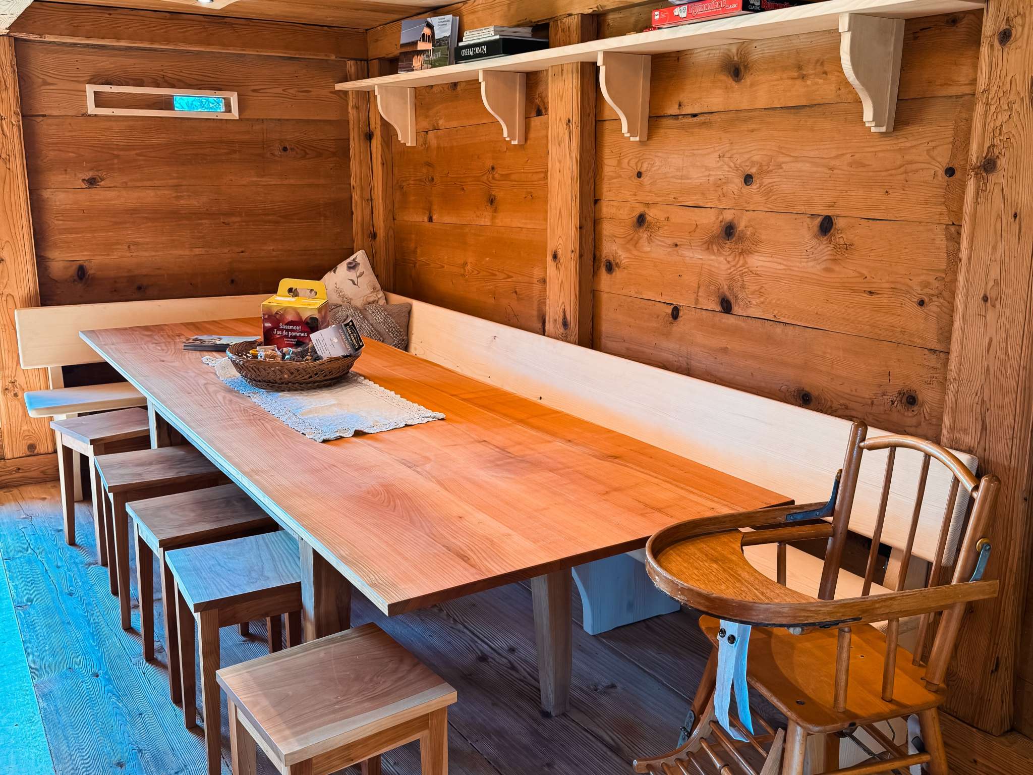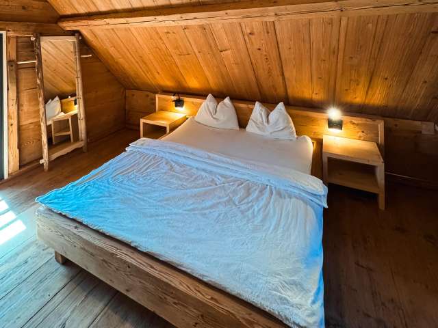 Der 1733 erbaute Speicher wurde 2024 komplett renoviert und hat dabei seinen charmanten Charakter beibehalten. Das Holzhaus strahlt Gemütlichkeit aus und bringt einem zurück zu den Wurzel und zur Natur. Das denkmalgeschützte Haus ist nicht beheizt, Wärme spenden dafür die Alpaka-Wollduvets, ein Lagerfeuer oder eine herzliche Umarmung der Mitreisenden.