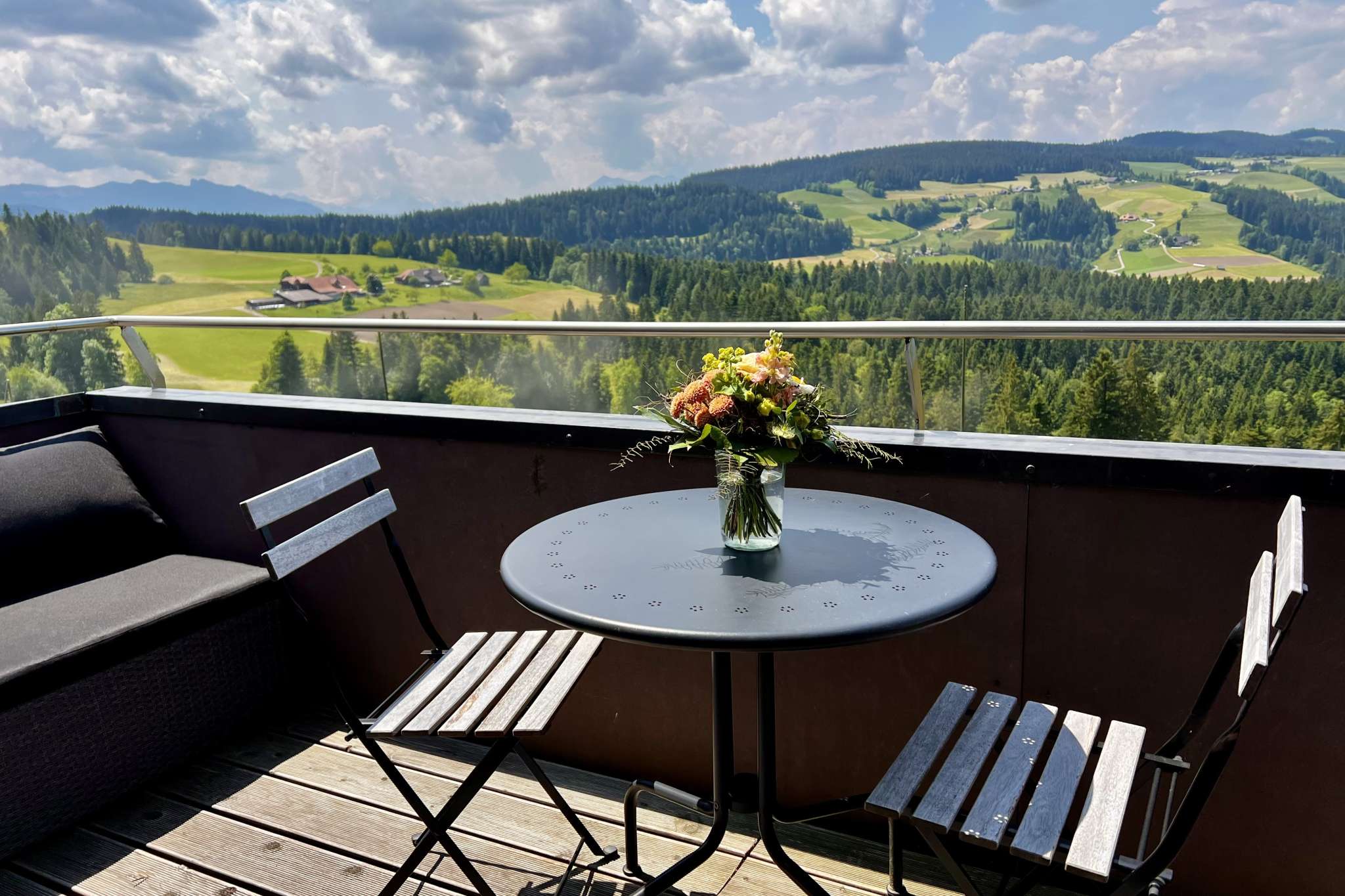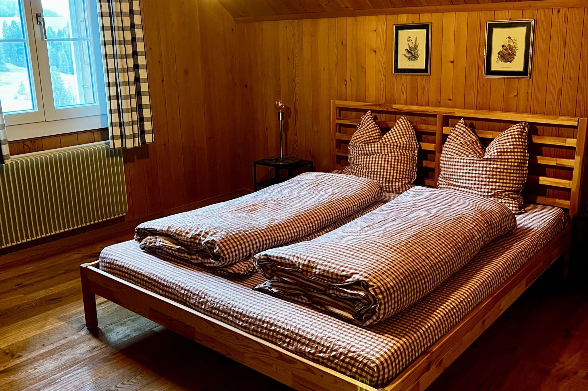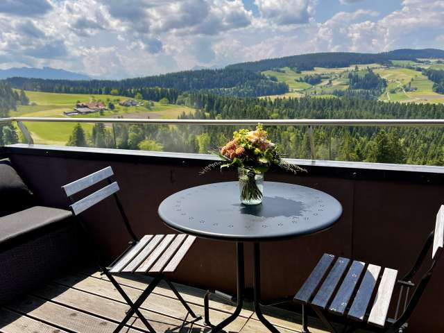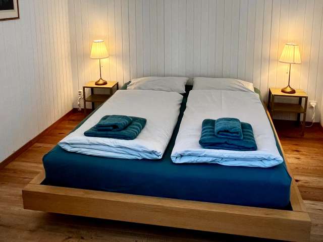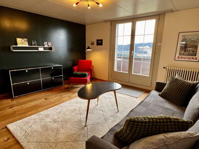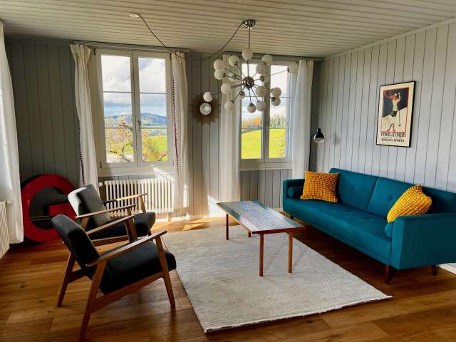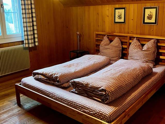 Die Ferienwohnung ist ideal für 1 – 2 Personen, befindet sich im 2. Stock und bietet eine fantastische Aussicht über die Hügel des Emmentals. Die Wohnung verfügt über ein Wohnzimmer mit Balkon, einer kleinen Küche, einem Schlafzimmer mit Doppelbett und ein Badezimmer mit Dusche. Haustiere sind nicht erlaubt. Details und Buchungsmöglichkeiten finden sie auf der Website.