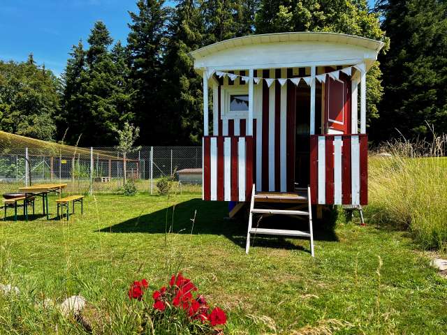 Der Zirkuswagen steht an einem idyllischen Platz mitten in der Natur und kann während den Sommermonaten für einzelne Übernachtungen oder einen längeren Aufenthalt gemietet werden. Der Wagen bietet Platz für maximal 2 Personen. Im privaten Aussenbereich stehen Liegegelegenheiten, Feuerschale, Tisch und Bank zur Verfügung. Neben dem Wagen steht eine Komposttoilette, Dusche und „normales“ WC können im Keller des Schulhauses benützt werden. Haustiere sind nicht erlaubt.