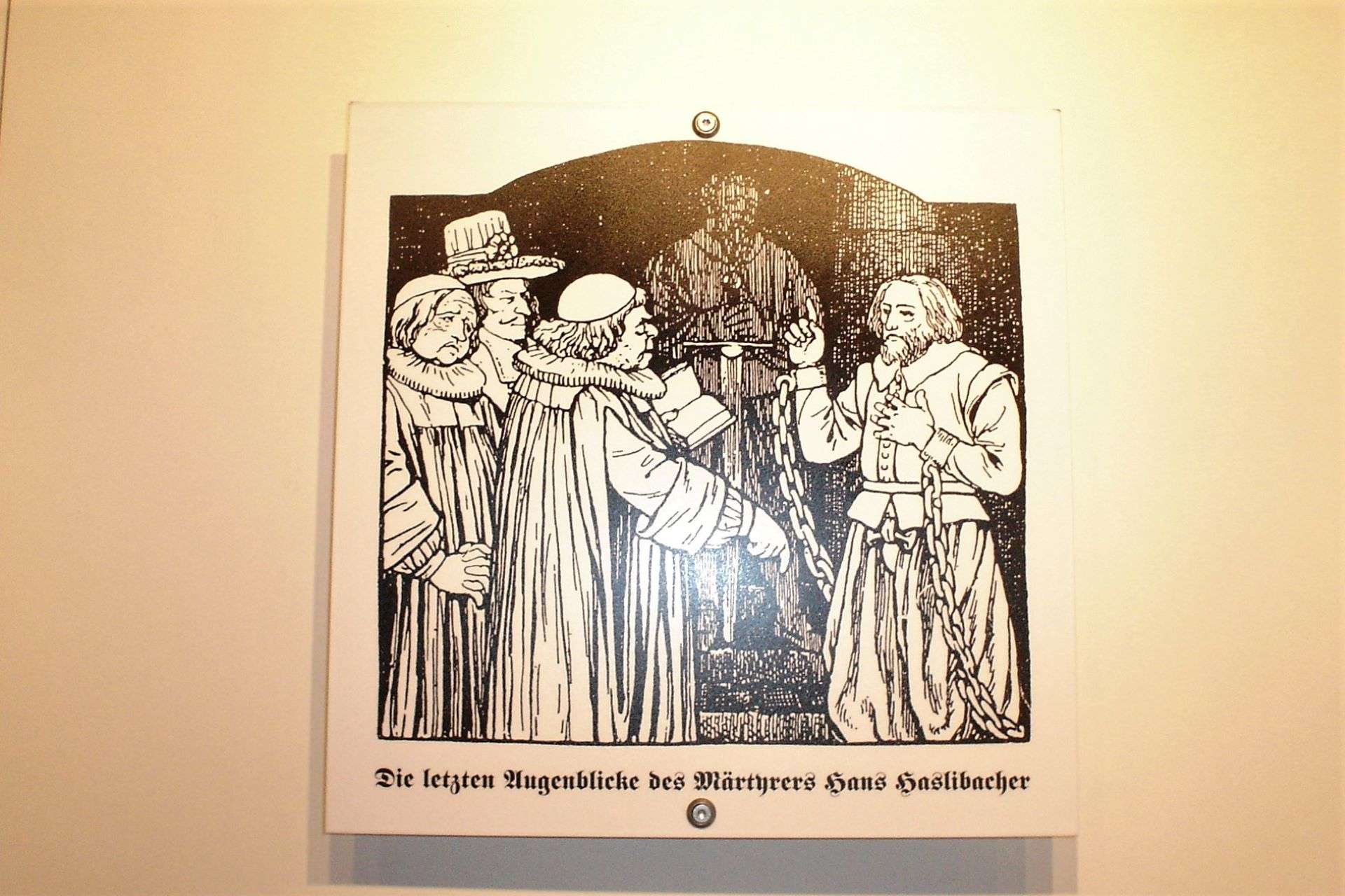 Auf dem Haslebacherhof wohnte der letzte Täufer, welcher 1571 von der Berner Regierung zum Tode verurteilt wurde. In einem Lied mit 32 Strophen wird berichtet, wie er «vom Leben zum Tod gerichtet» wurde. In dieser Ausstellung können im Raum «Schimpf und Schande» die Strophen zur Melodie des Haslebacher Liedes gelesen werden. Gegenüber im Bergfried von Schloss Trachselwald kann das Haslebacher Lied gesungen von Amischen gehört werden.