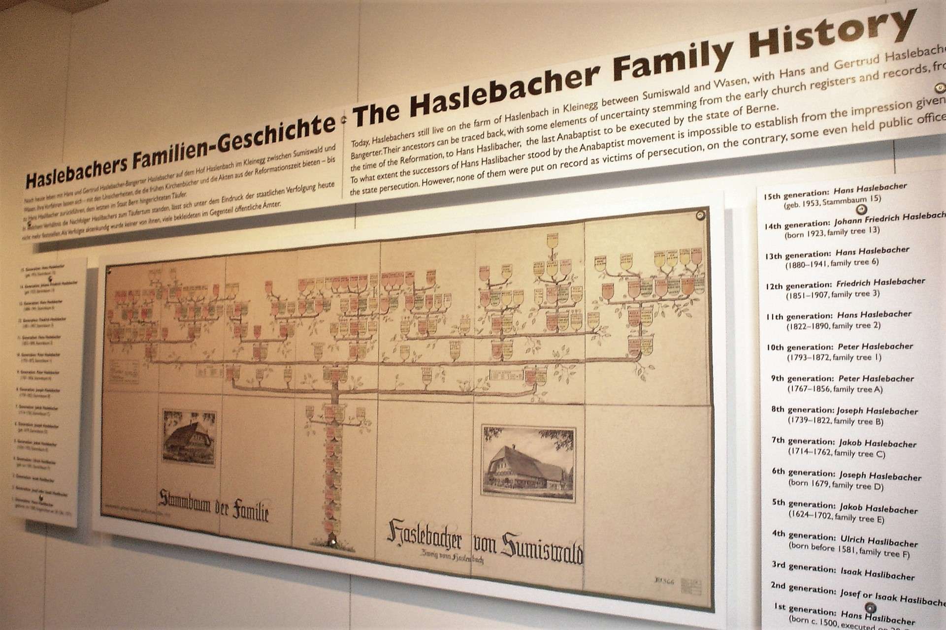 Seit 2007 befindet sich im Speicher eine familiengeschichtliche Ausstellung, die bis ins 16. Jahrhundert zurückführt. In dieser Zeit entstand die Täuferbewegung, ein dunkles Kapitel in der Schweizer Geschichte. Der Vorfahre der Familie, Hans Haslibacher, war ein Täufer und Täuferlehrer, aber die Obrigkeit duldete diese Glaubensgemeinschaften nicht und verfolgte diese Menschen bis aufs Blut. Bei einer Führung erfahren Sie mehr zu dieser Geschichte sowie einen kleinen Einblick in das Leben von Amischen in Amerika, welche den Glauben noch heute leben.