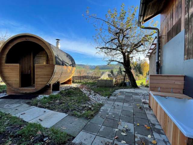 Sie können von einem genussvollen Wellness- und Hofprodukteangebot profitieren. Die Fasssauna bietet Platz für 2 bis 4 Personen und bildet zusammen mit dem Kneippweg, einer Aussendusche und dem Eisbad eine kleine aber feine Wellnesslandschaft. Die Sauna kann auch während 180 Minuten von Tagesgästen gebucht werden: RESERVATION SAUNA