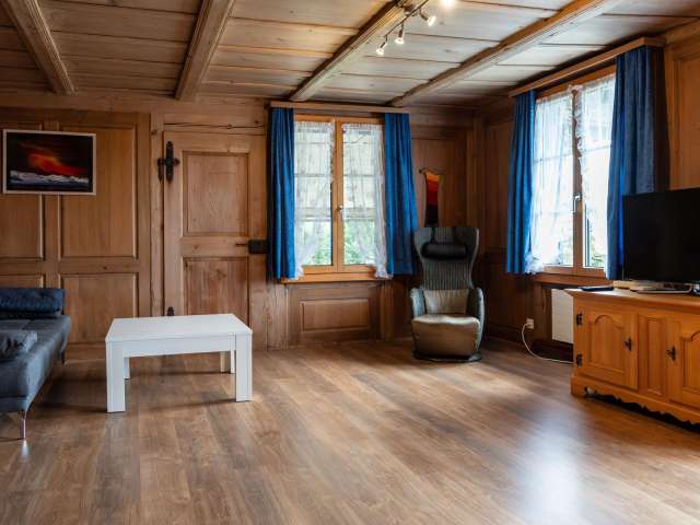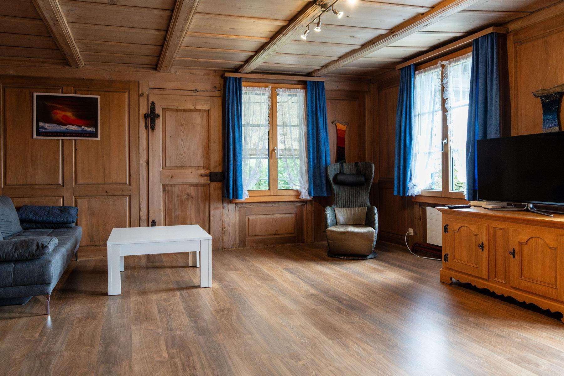 Um sich vom Alltag zu erholen, geniessen Sie in der Ferienwohnung WYLER die Ruhe und Abgeschiedenheit. Die grosse 3 Zimmer-Ferienwohnung mit Balkon hat zwei Schlafzimmer, ein Wohnzimmer mit Schlafsofa, eine Küche mit Esstisch und ein Bad mit Dusche und WC. Sie befindet sich im 1. Stock des 1842 erbauten Bauernhauses und bietet Platz für bis 6 Personen. Ein Babybett und ein Hochstuhl können auf Wunsch bereit gestellt werden. Die Wohnung ist voll ausgestattet und es sollte Ihnen an nichts fehlen.
