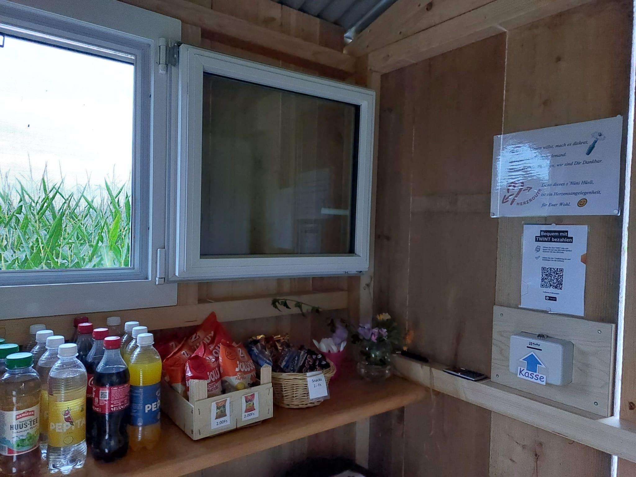 Das Hüsli ist täglich geöffnet (Selbstbedienung) und bietet die Möglichkeit sich zu stärken mit Getränken, Glace, Snacks, Alpkäse, usw.