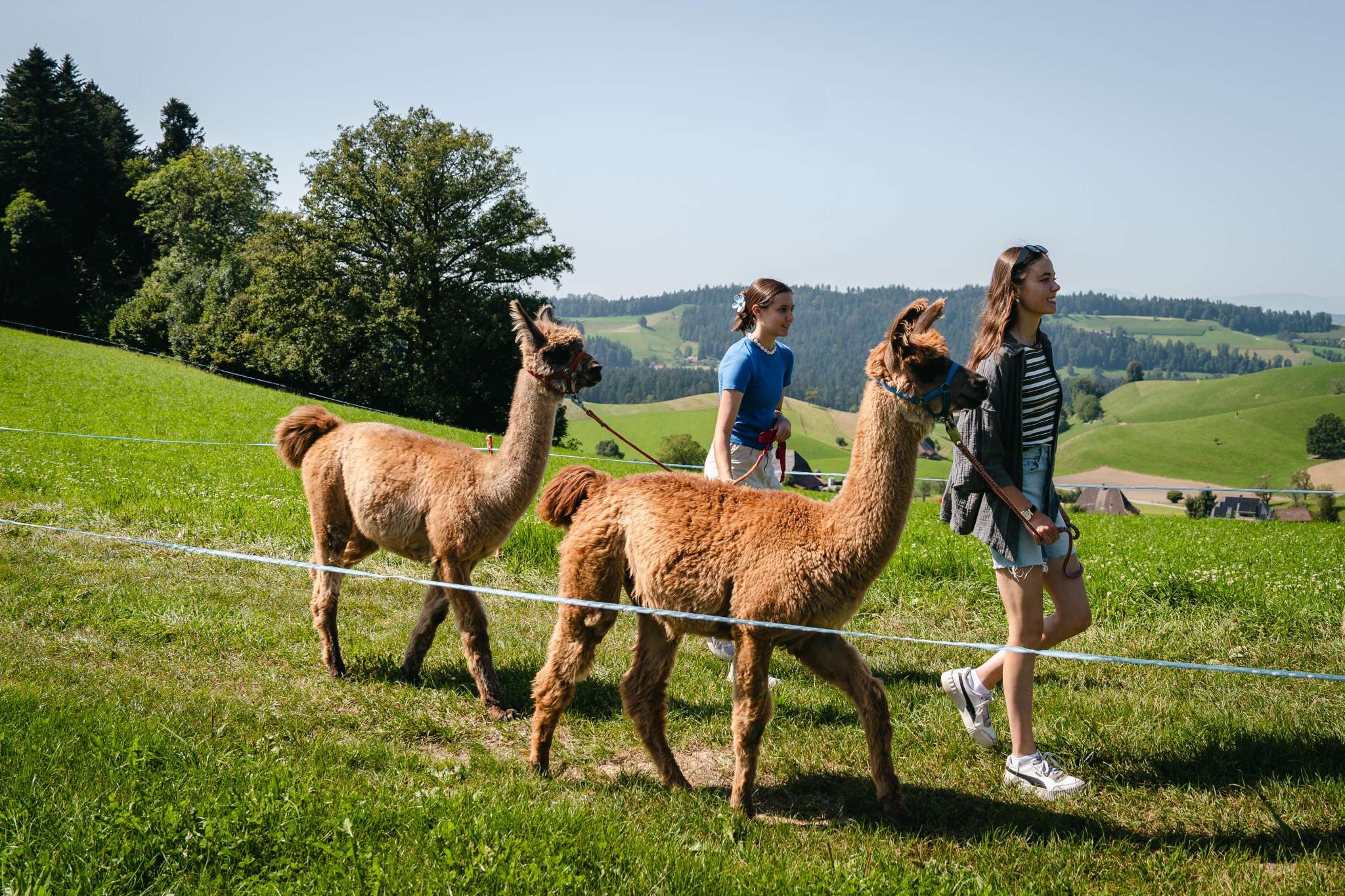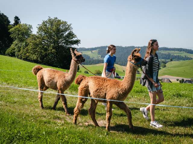 Lamas, die zur Gattung Kamele gehören, sind in Südamerika beheimatet. Das schweizerische Klima behagt ihnen sehr. Ihr sanfter, gutmütiger Charakter begeistert immer wieder. Auf dem Lamahof Tschäppel können Sie mit den Tieren näher in Kontakt zu kommen und eine Wanderung mit den Lamas und einer Begleitperson zu unternehmen Die Lamawanderungen sind als Gruppenaktivität buchbar. Einzelpersonen können sich bei den rund 12 öffentlichen Lamawanderungen pro Jahr anmelden.