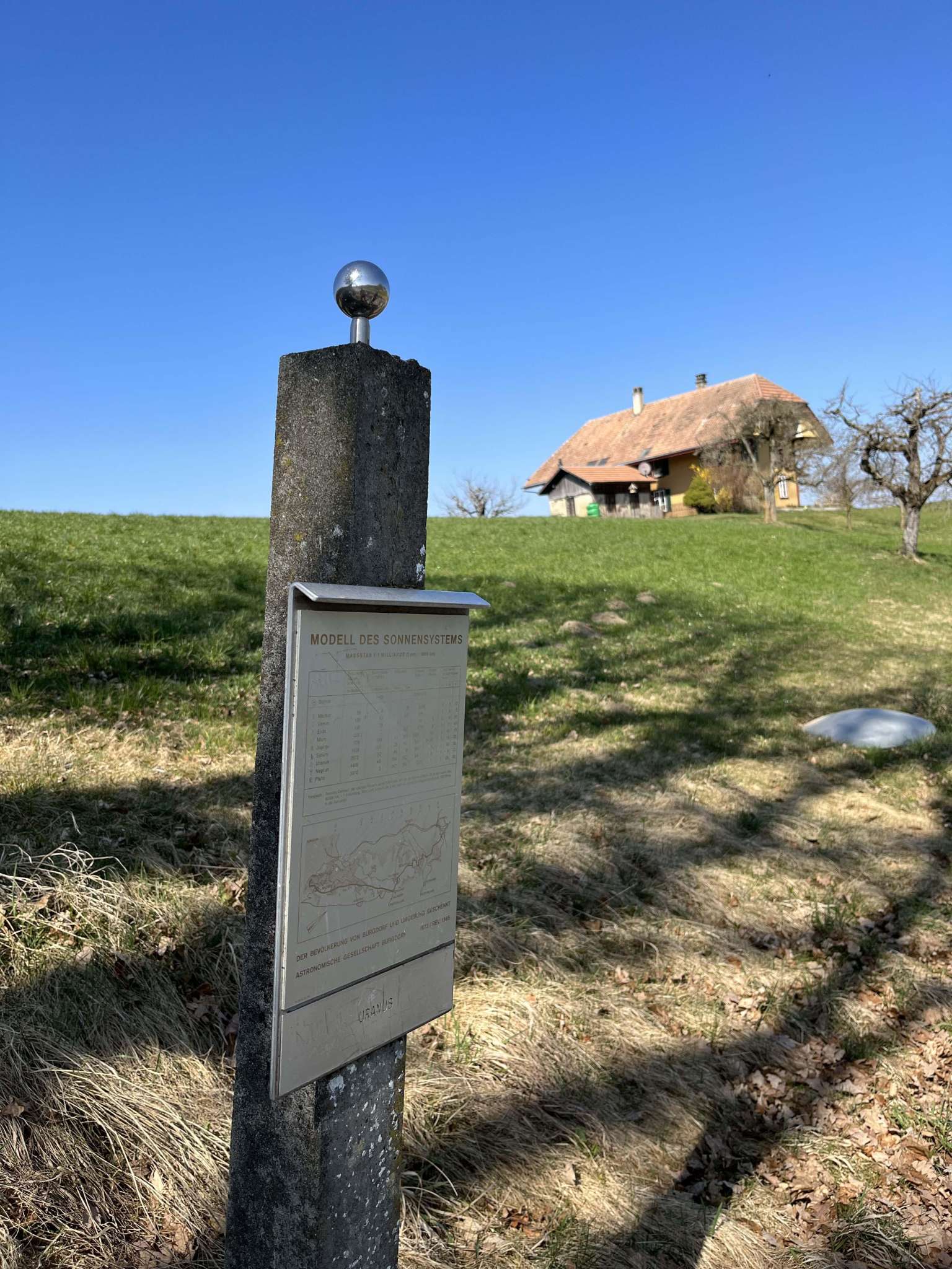 Entdecken Sie die Grössenverhältnisse unseres Sonnensystems auf dem Planetenweg Burgdorf. Im Massstab von 1:1 Milliarde wird, durch ein auf einer Strecke von rund 6 km verteiltes Freilichtmodell, die Grösse der Sonne und der Planeten sowie die Entfernung der Planeten von der Sonne gezeigt.