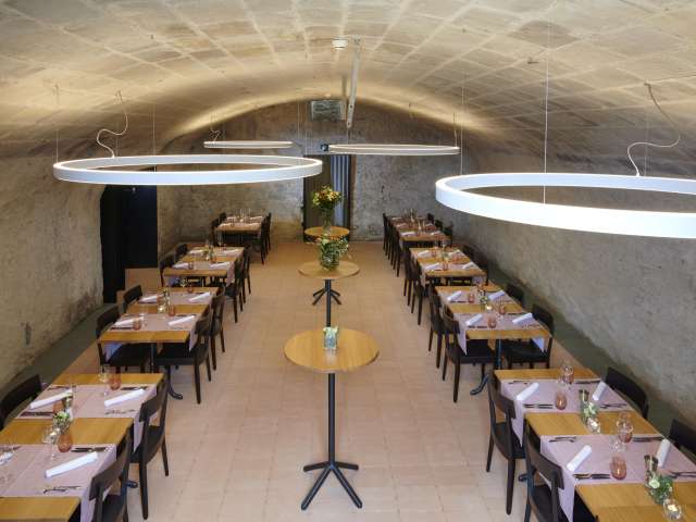 Stein ist nicht gleich Stein – der alte Gewölbekeller wurde zu einem grossen Eventraum für bis zu 100 Personen konzipiert und erstrahlt nach grundlegender Sanierung nun wieder in neuem Glanz.