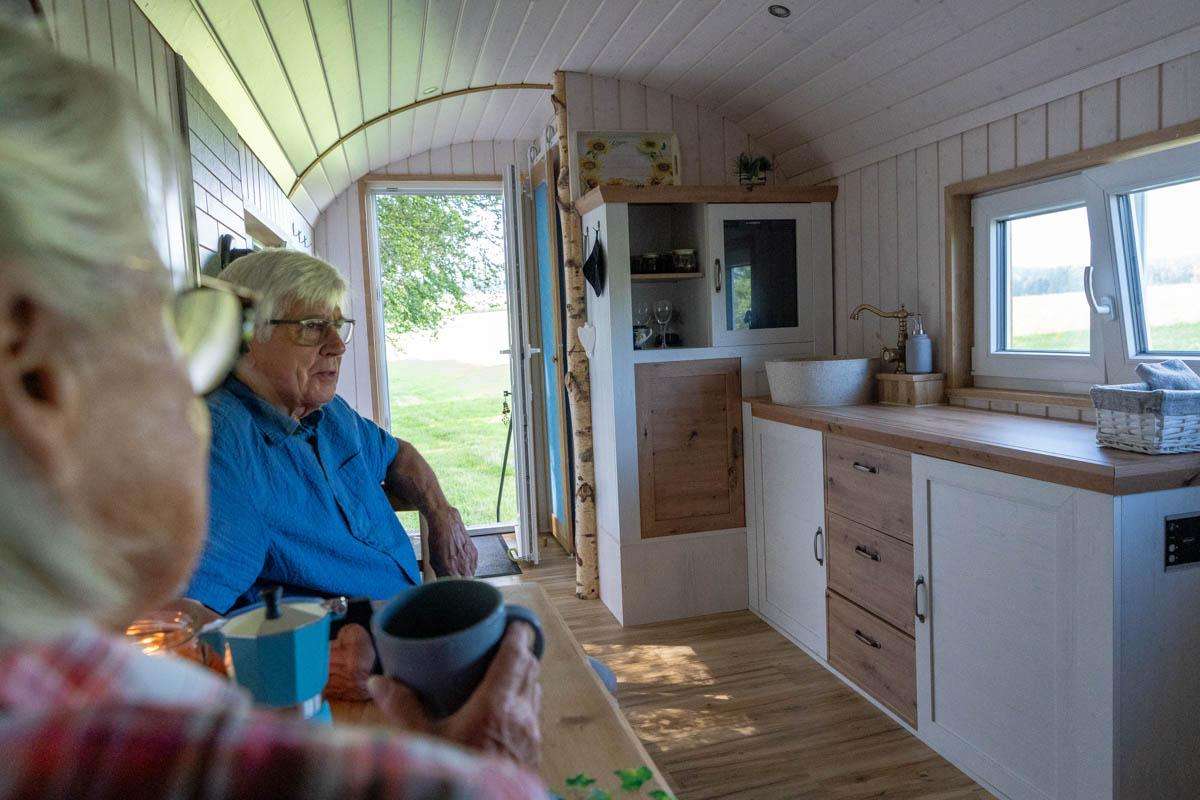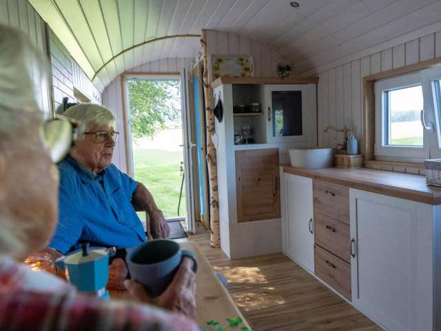 Der Zirkuswagen ist mit einem Doppelbett ausgestattet, und für kleine Gäste steht eine Luftmatratze zur Verfügung. Im Wagen gibt es fliessendes Wasser, und bei Bedarf kann auf dem Hof geduscht werden. Als Toilette steht eine Trockentrenntoilette zur Verfügung. Eine Kochgelegenheit gibt es draußen auf einem Campingkocher oder direkt über dem Feuer. Für diejenigen, die nicht selbst kochen möchten, stehen verschiedene Restaurants in der Umgebung zur Verfügung.