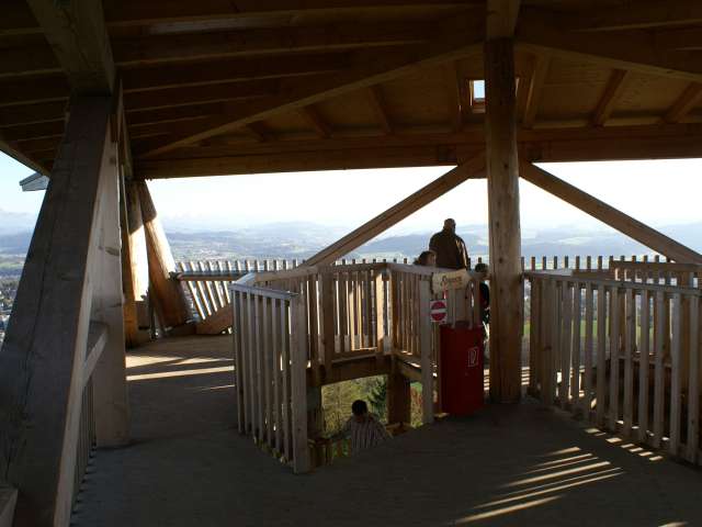 Von der überdachten Plattform auf 34 Metern Höhe bietet sich eine einzigartige Aussicht über die Stadt und Region Wil, über das Fürstenland, den Hinterthurgau, das Toggenburg, den Alpstein mit dem mächtigen Säntis bis zu den sieben Churfirsten. Drei grosse Panoramatafeln dienen der Orientierung.